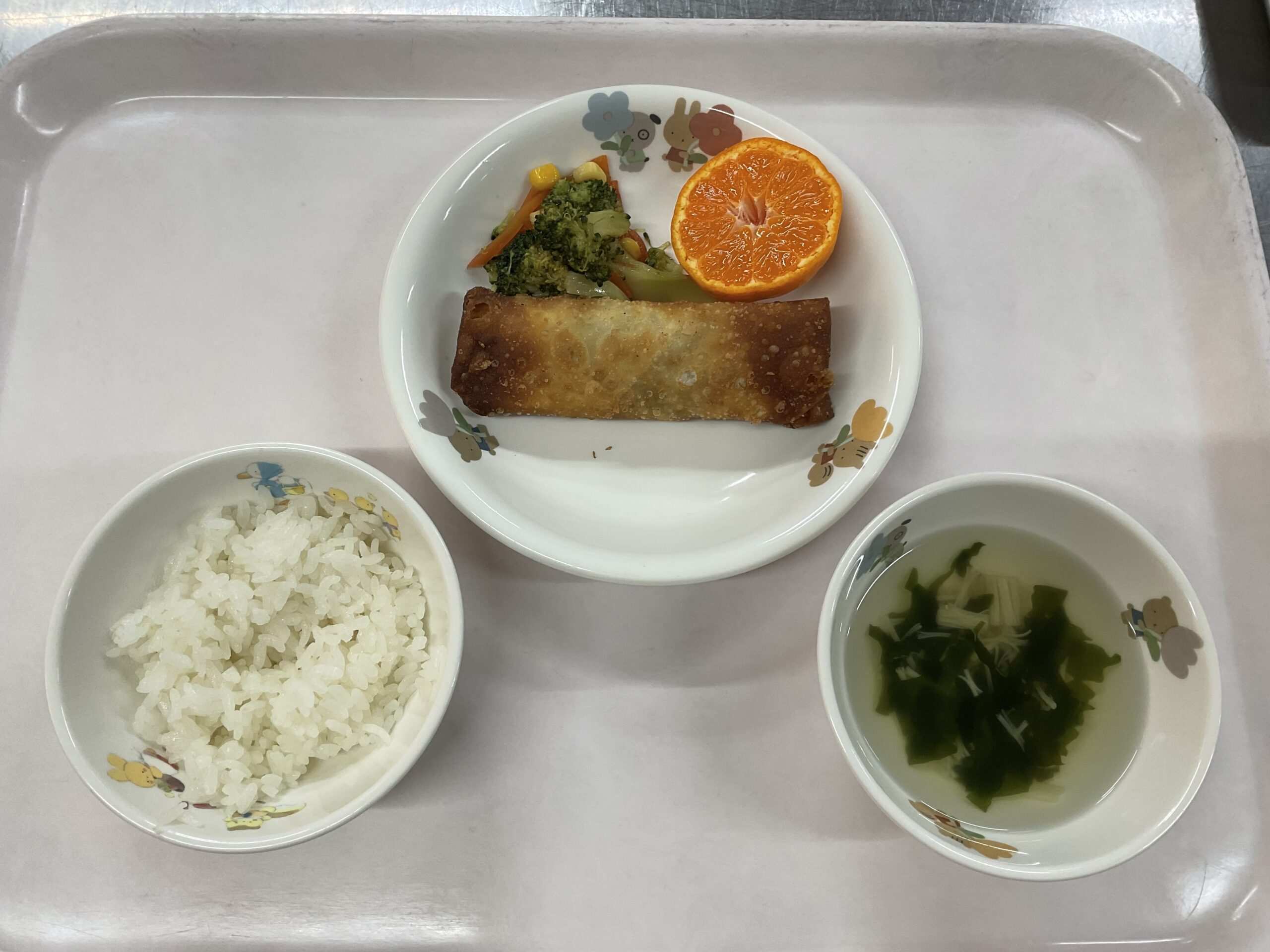 白米 春巻き ブロッコリーサラダ えのきとわかめのスープ みかん