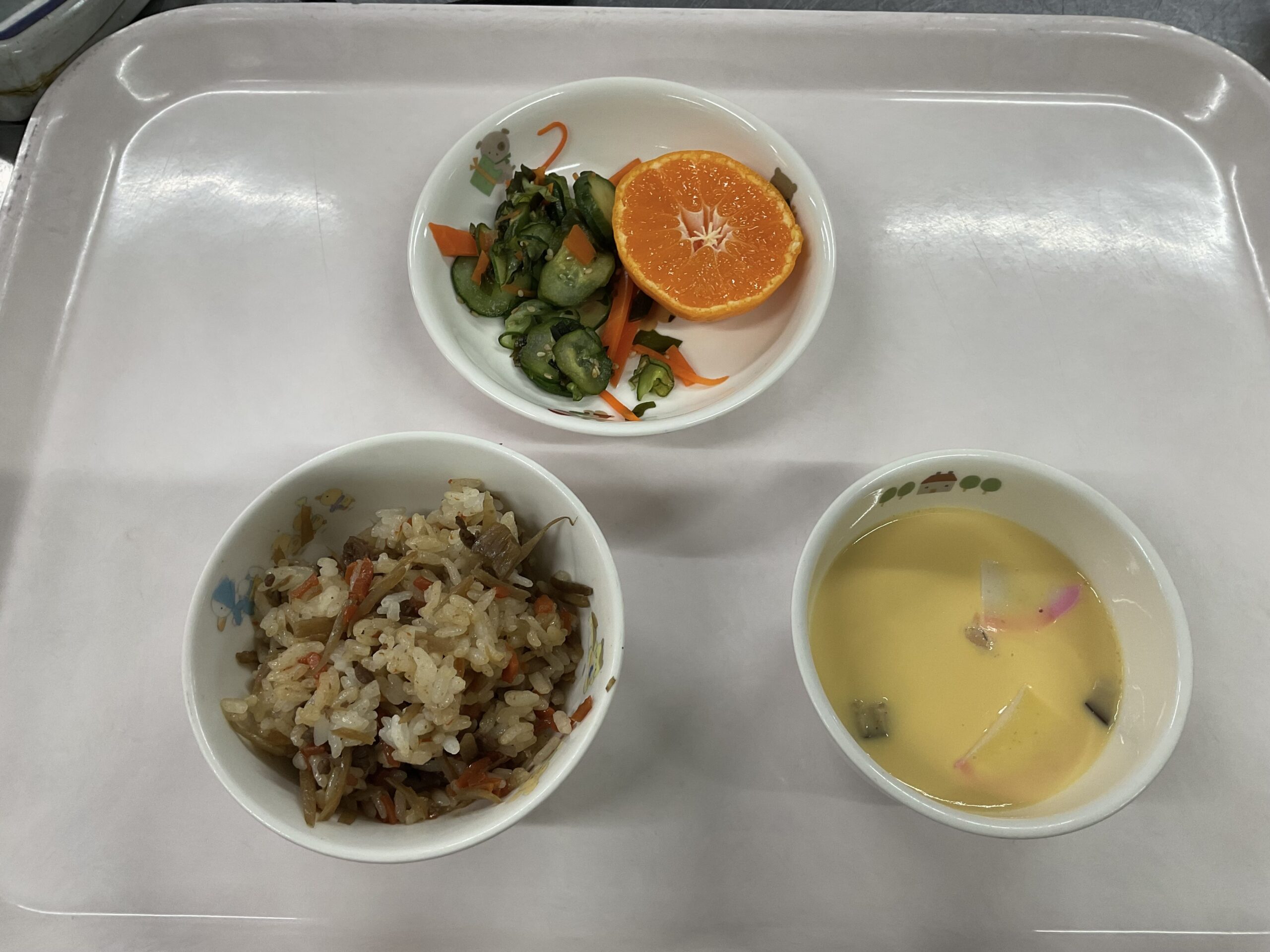 牛肉とごぼうの混ぜご飯 茶碗蒸し きゅうりの酢の物 みかん