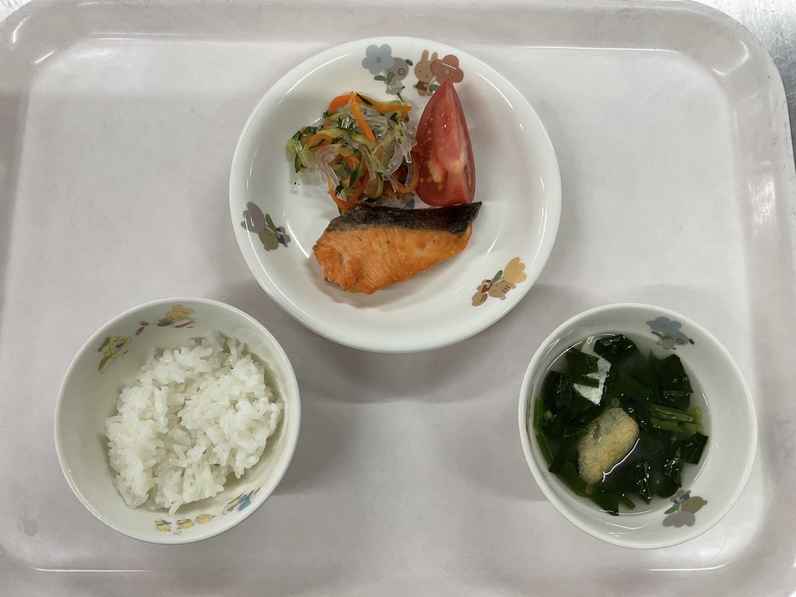 白米 鮭のムニエル 春雨サラダ トマト ほうれん草と油揚げの味噌汁