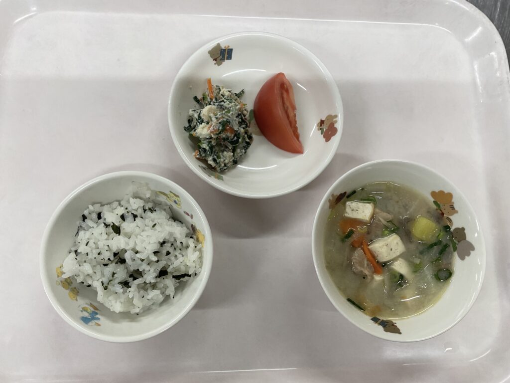 わかめごはん 豚汁 ほうれん草の白和え トマト