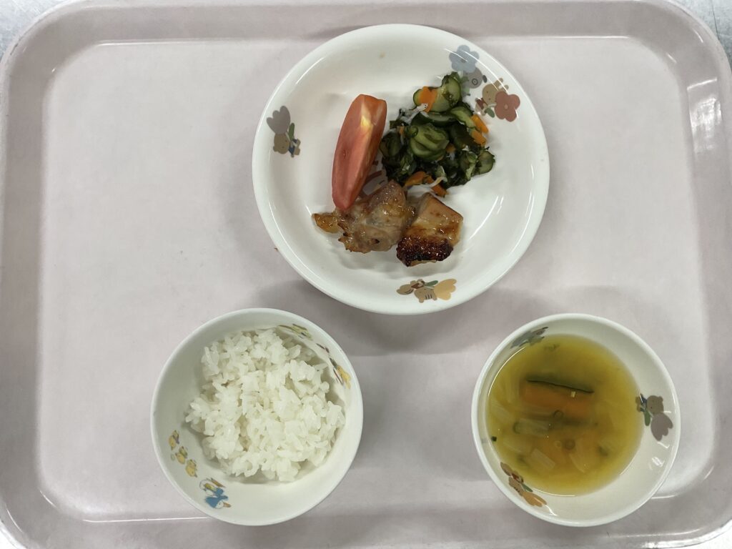 白米 鶏肉のマーマレード焼き しらすとわかめの酢の物 トマト 南瓜の味噌汁