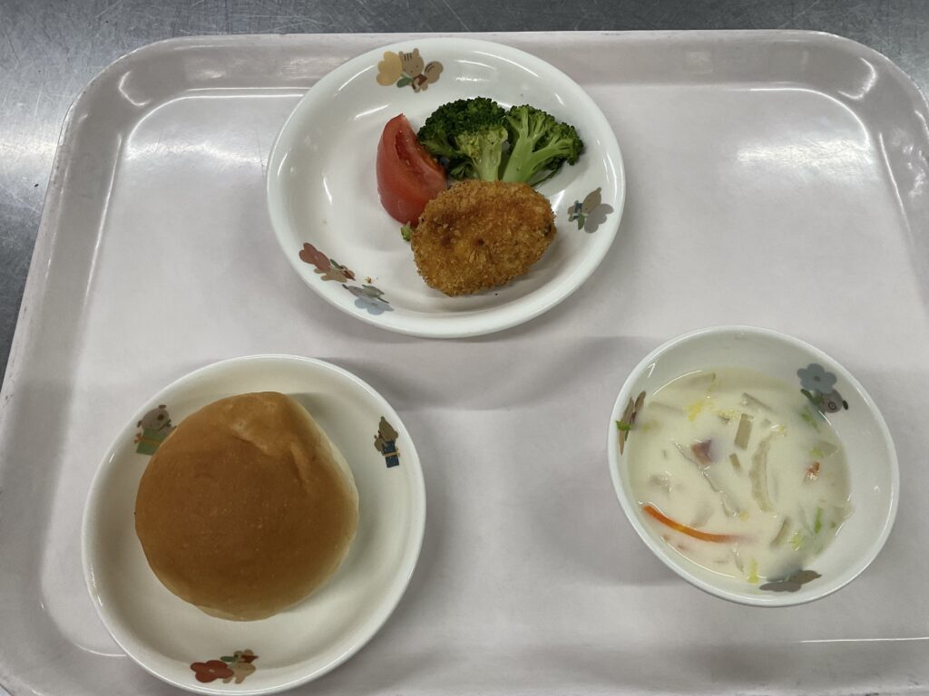 黒糖パン コロッケ ゆでブロッコリー トマト 野菜の豆乳スープ