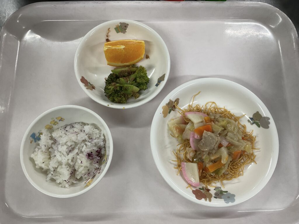ゆかりご飯 皿うどん ブロッコリーのおかか和え オレンジ