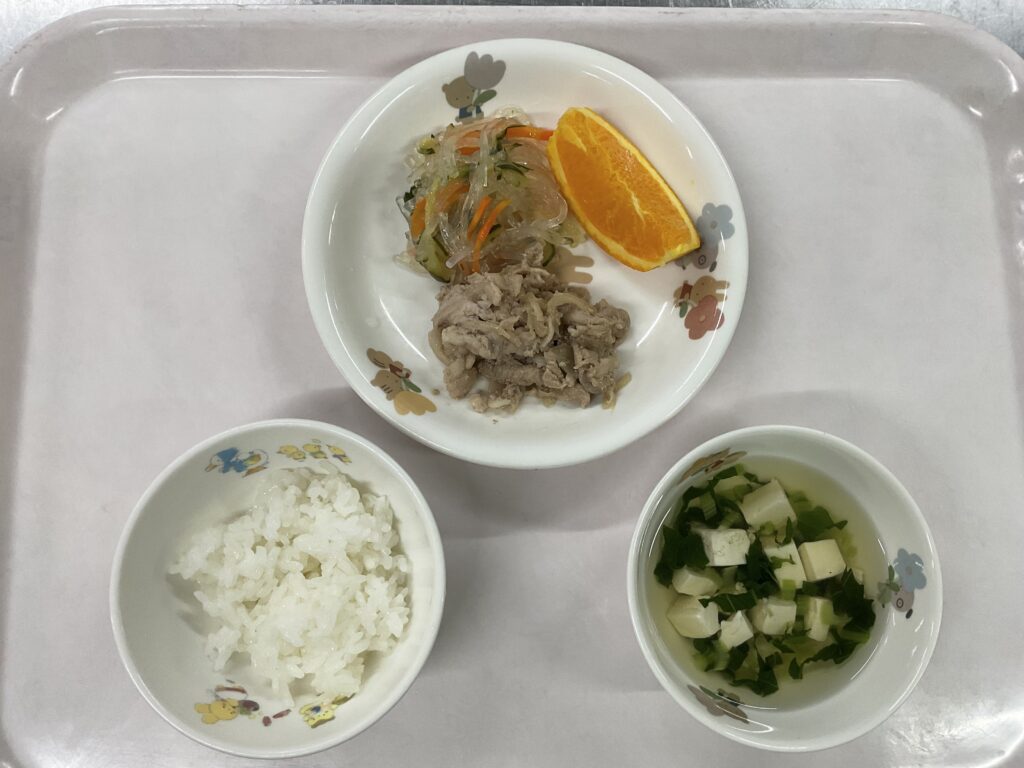 白米 豚肉の味噌炒め 春雨の酢の物 豆腐と小松菜のすまし汁 オレンジ