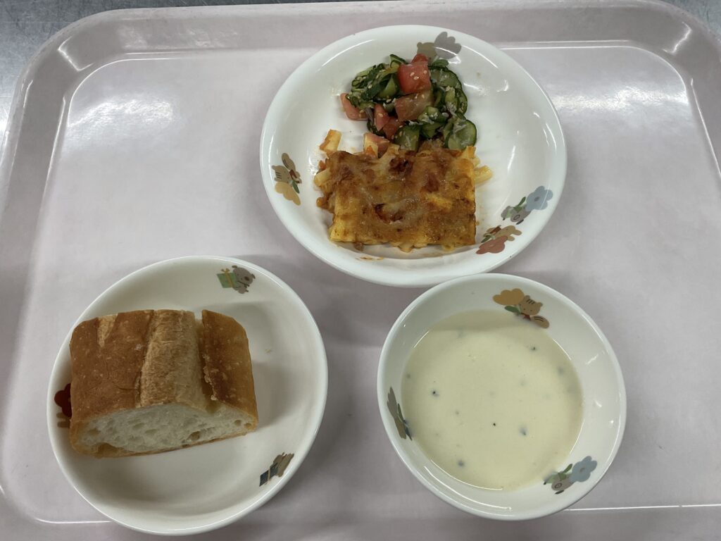フランスパン ミートグラタン きゅうりとトマトのサラダ コーンスープ