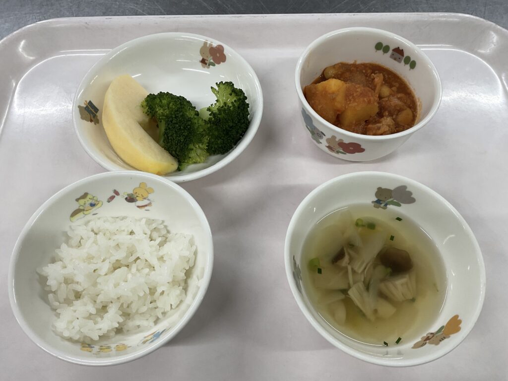 白米 じゃが芋のチリコンカン ゆでブロッコリー きのこスープ りんご