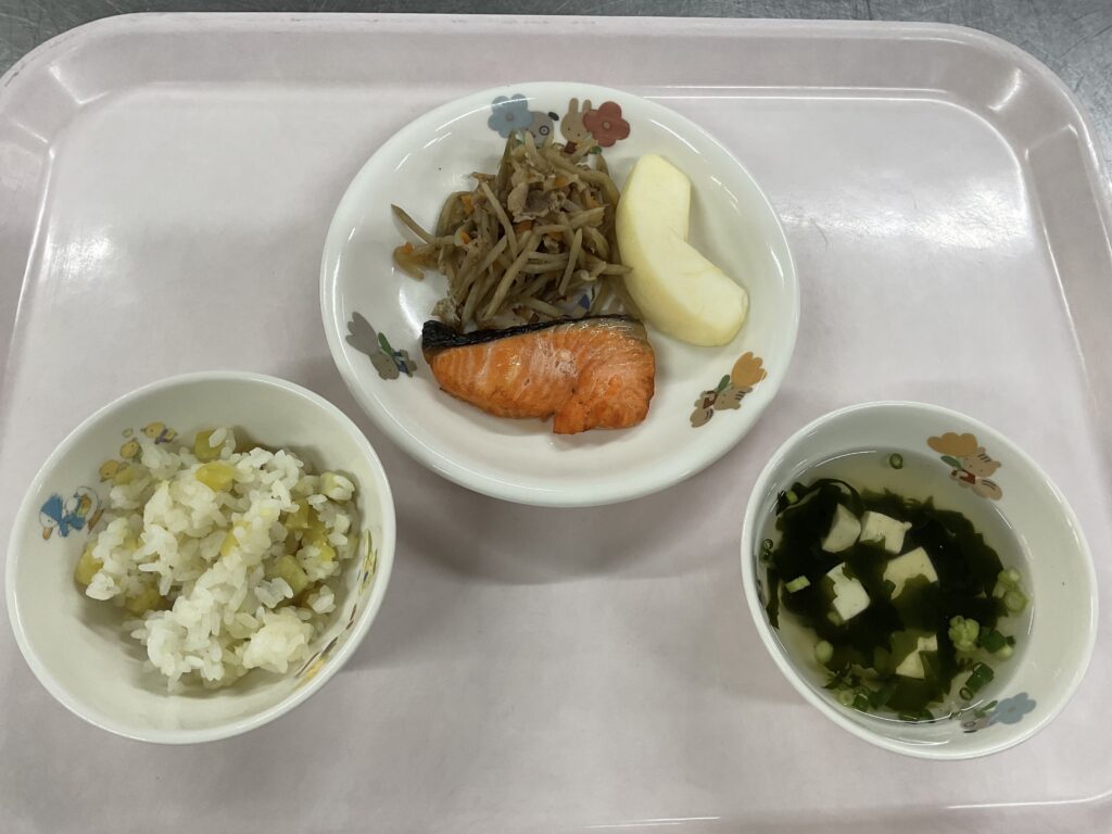 さつま芋ご飯 鮭の塩焼き 浦上そぼろ 豆腐とわかめのすまし汁 りんご