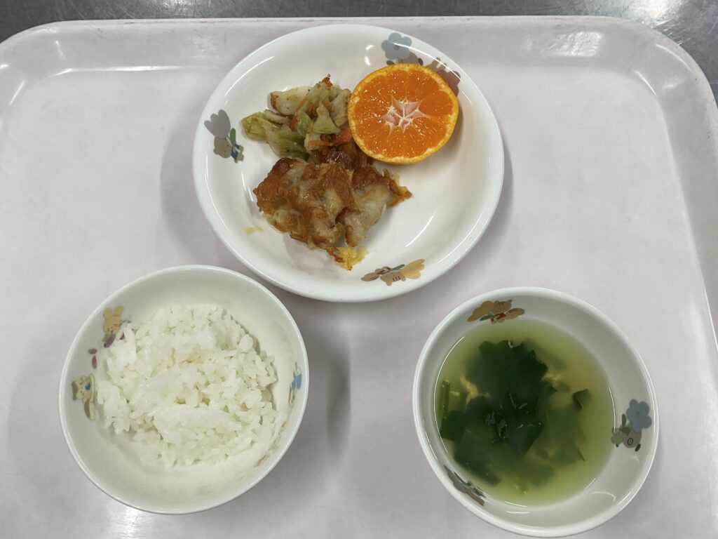 白米 鶏肉のチーズ焼き キャベツと竹輪の胡麻和え ほうれん草のスープ みかん