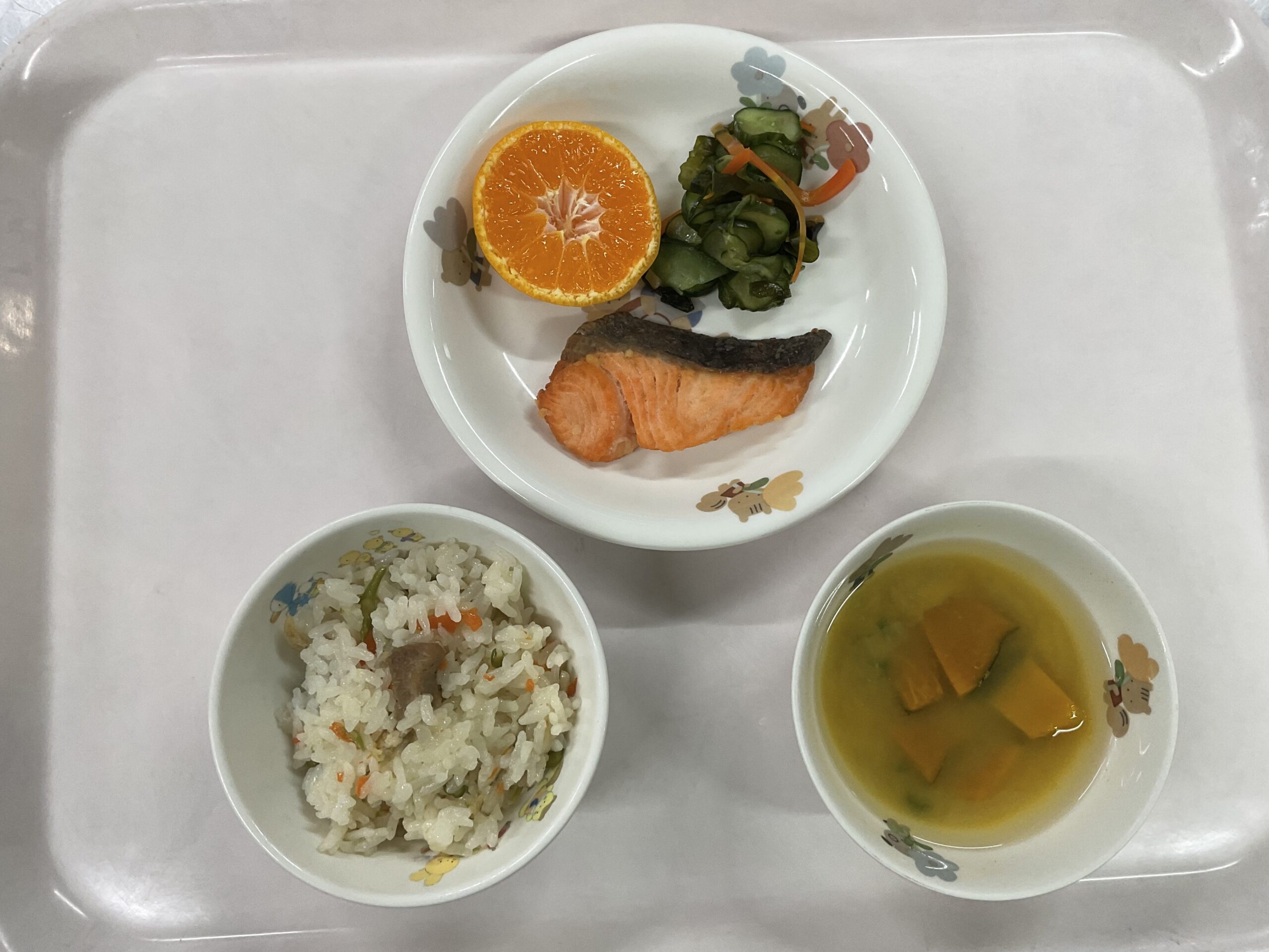 炊き込みご飯 鮭のムニエル きゅうりの酢の物 かぼちゃの味噌汁 みかん