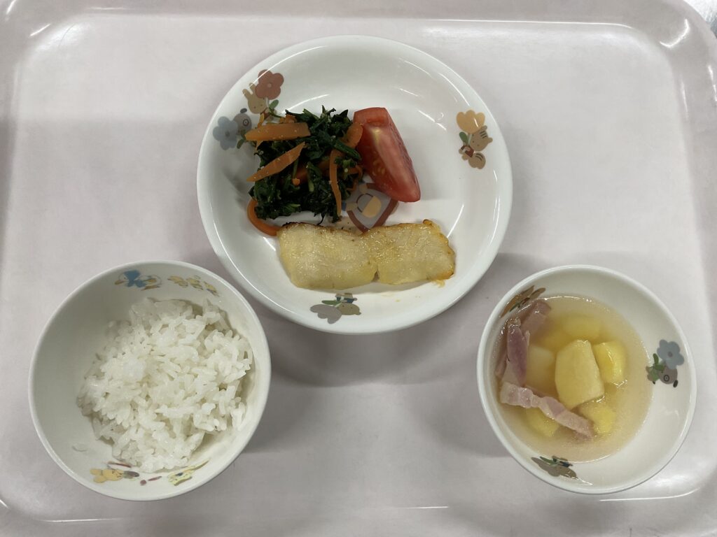 白米 魚の味噌マヨネーズ焼き ほうれん草のごま和え トマト ベーコンポテトスープ