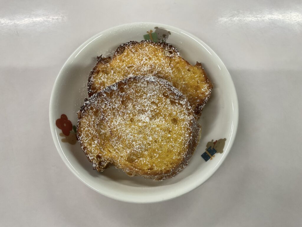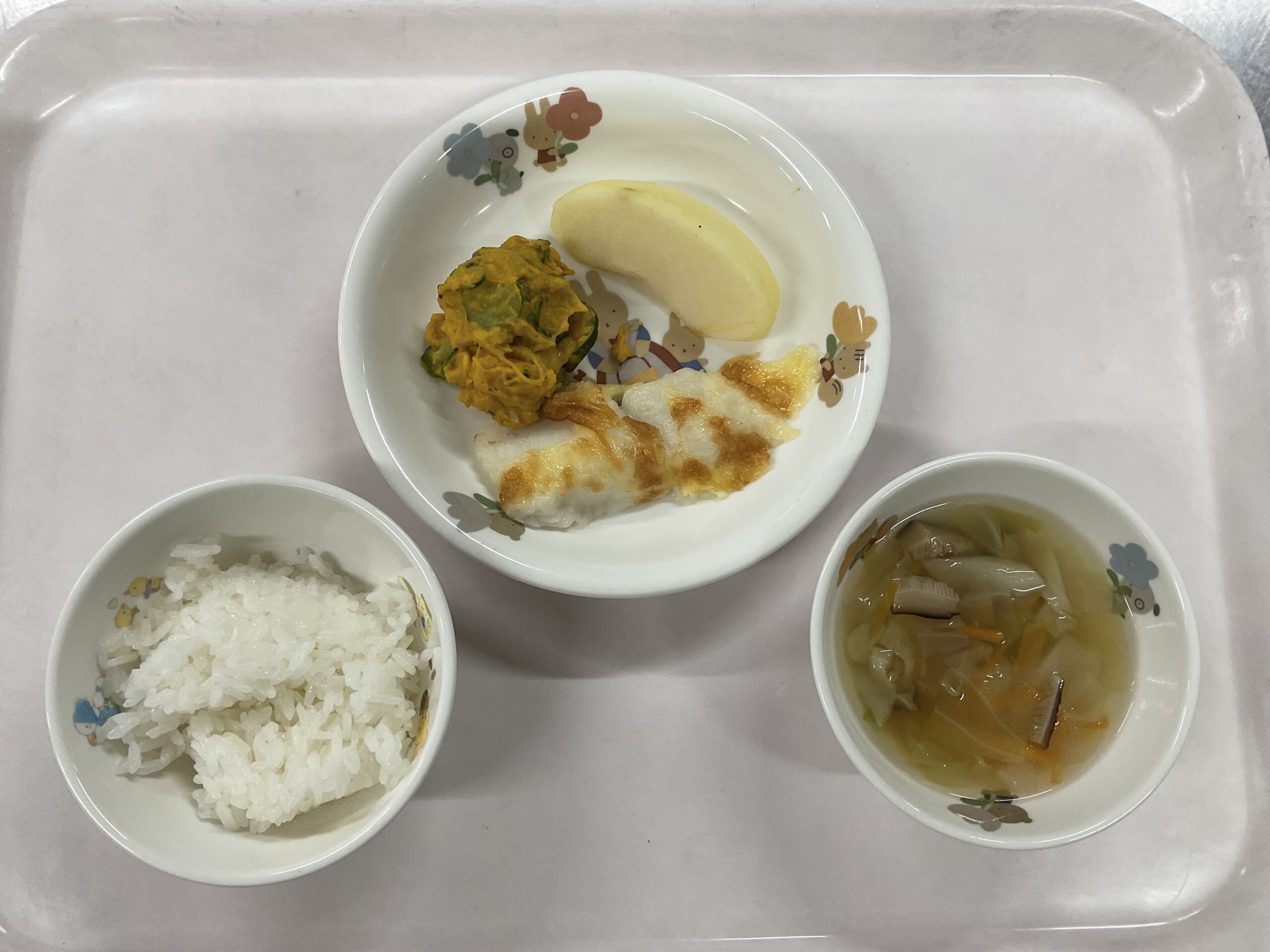 白米 魚のチーズ焼き 南瓜サラダ しいたけとキャベツのチキンスープ りんご