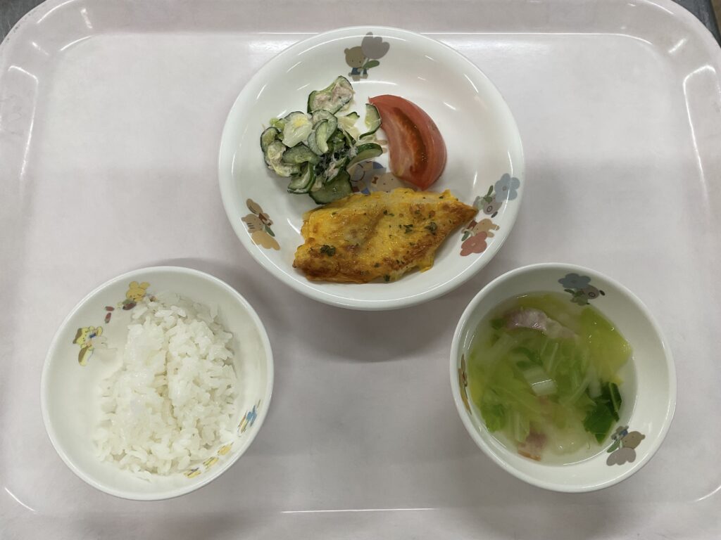 白米 魚のピカタ ツナサラダ トマト 白菜とベーコンのスープ