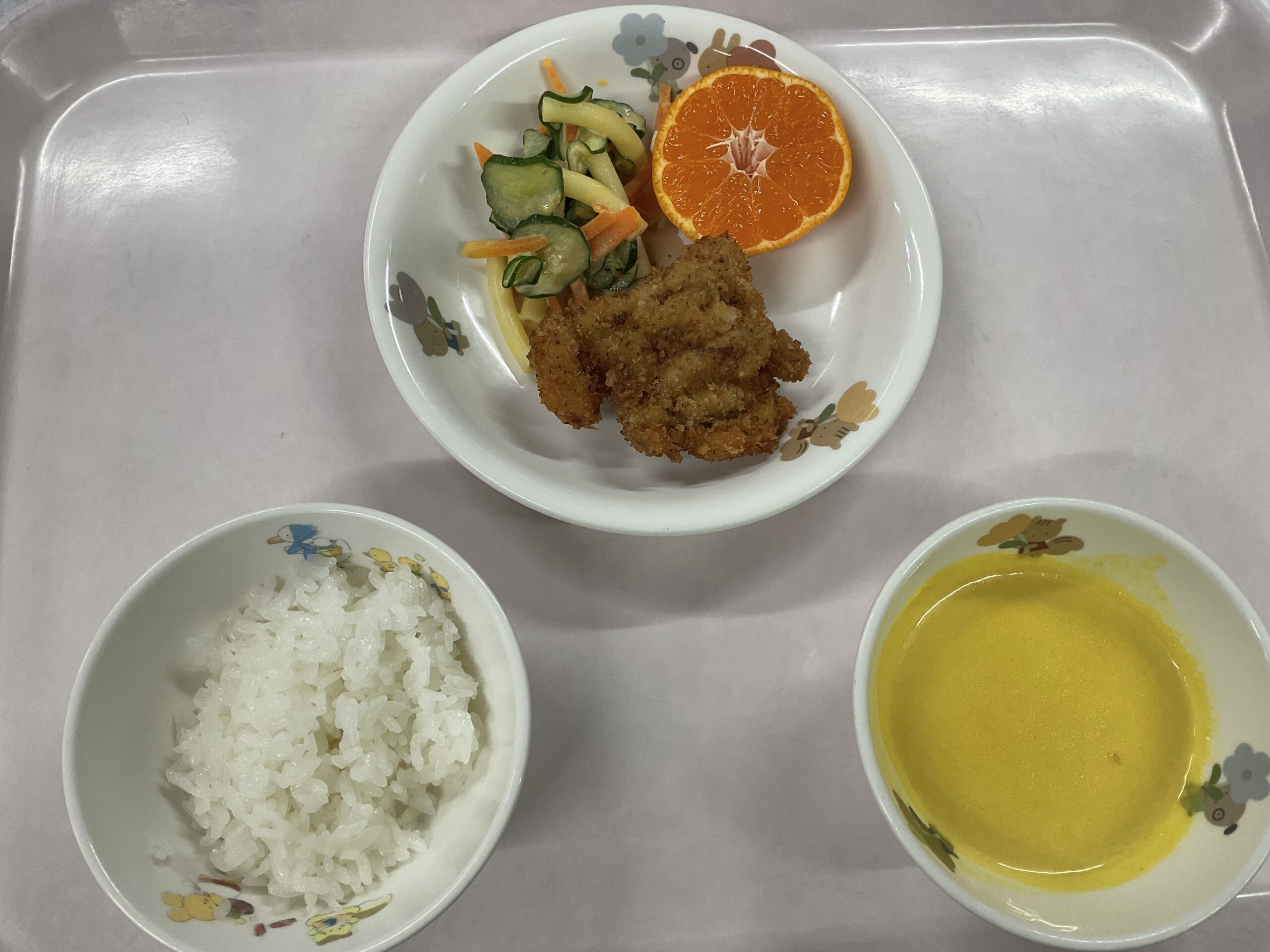 白米 チキンカツ マカロニサラダ パンプキンスープ みかん