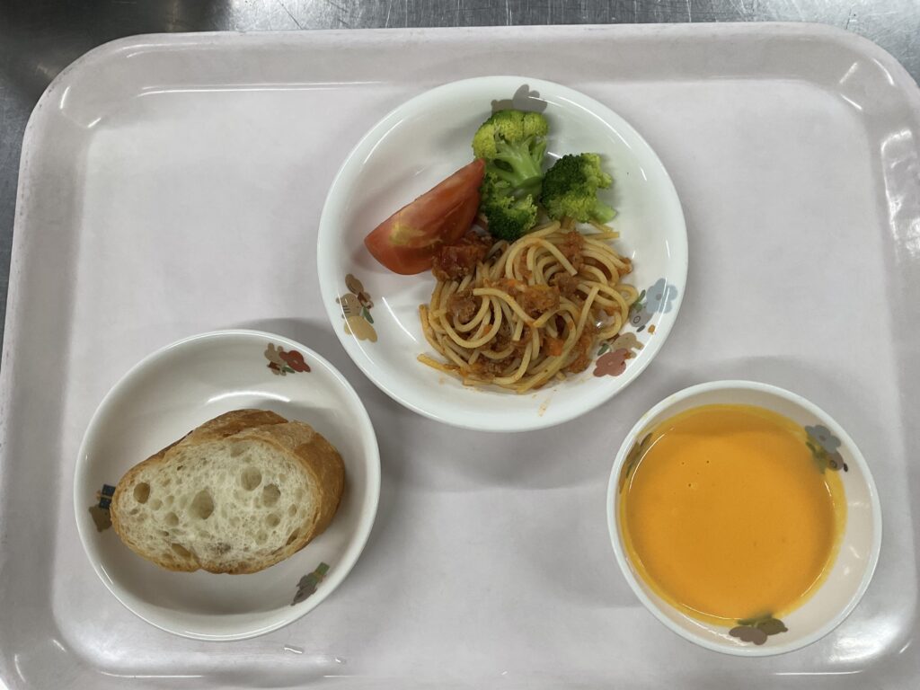 フランスパン スパゲティミートソース ゆでブロッコリー トマト 人参ポタージュ