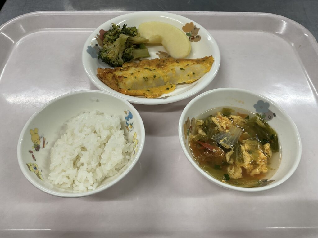 白米 魚のチーズピカタ ブロッコリーの胡麻和え トマトレタス卵スープ りんご
