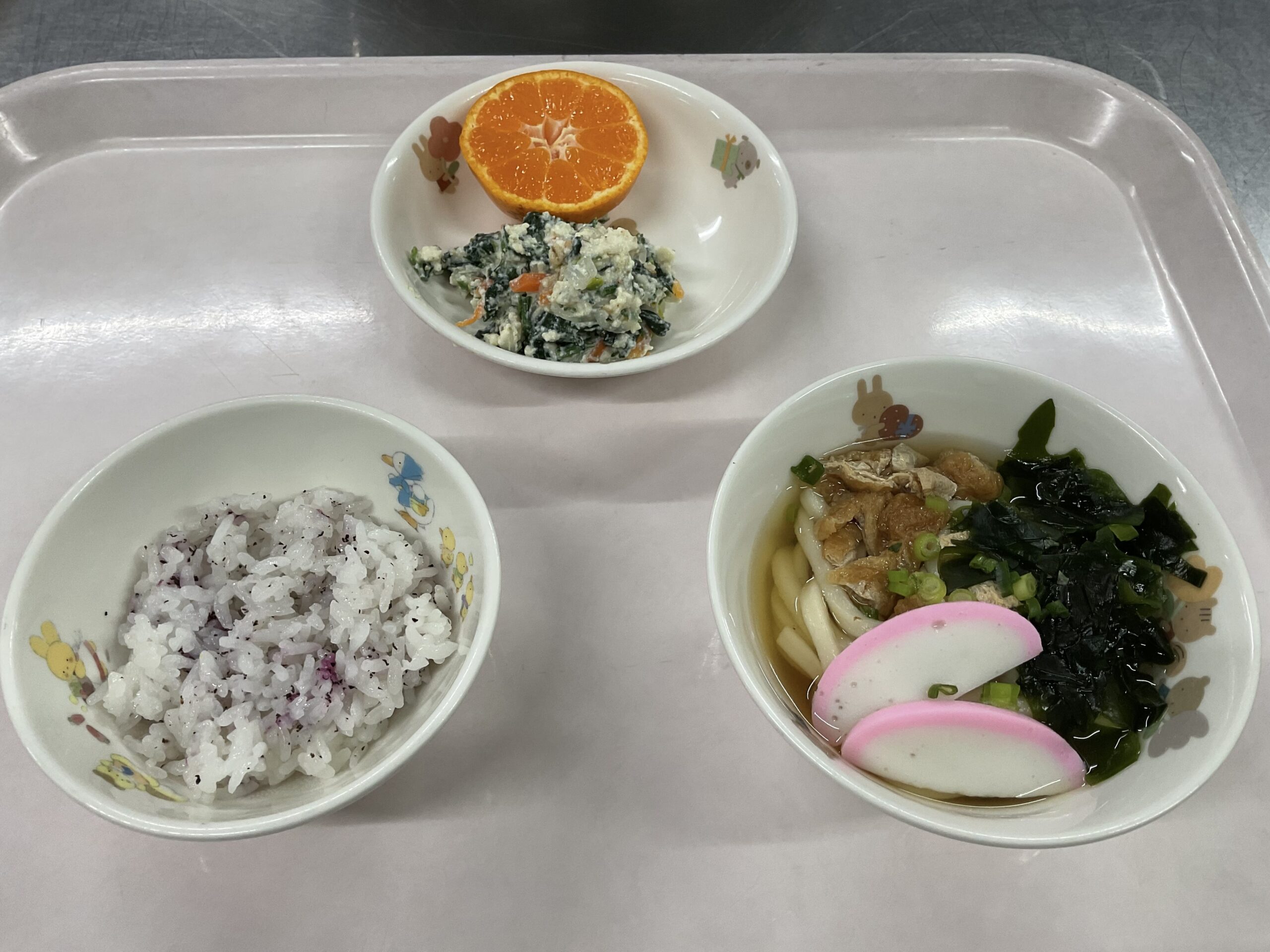 ゆかりご飯 きつねうどん ほうれん草の白和え みかん