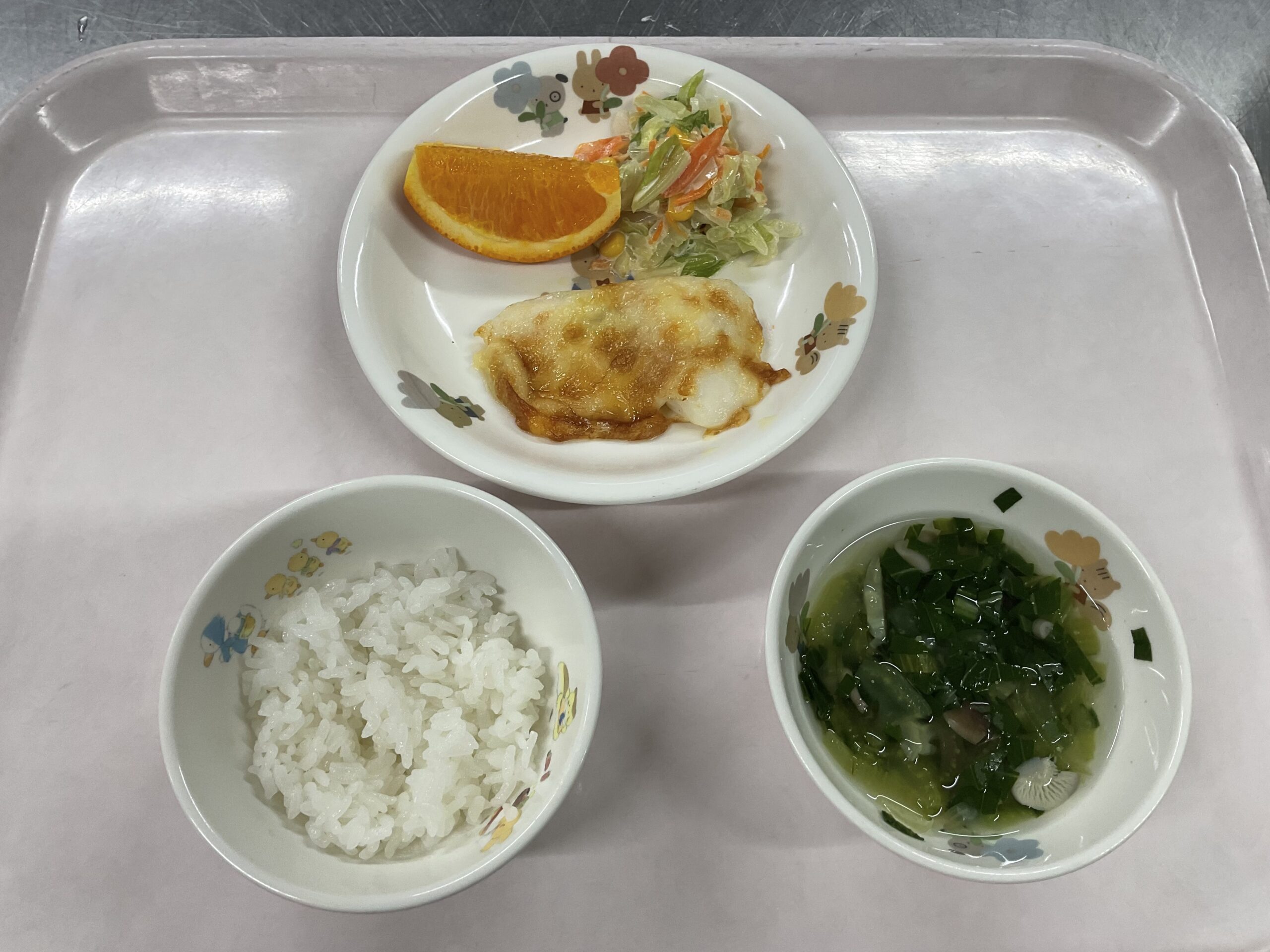 白米 魚のチーズ焼き コールスローサラダ チンゲン菜のスープ オレンジ