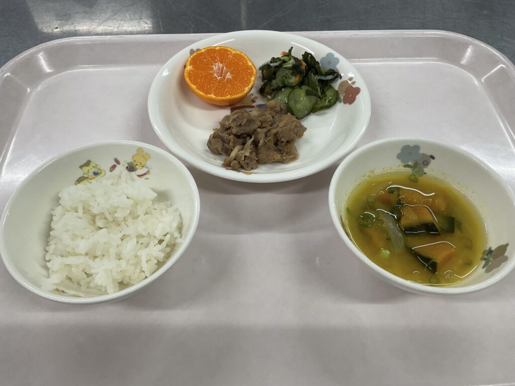 白米 豚肉の生姜焼き しらすとわかめの酢の物 南瓜の味噌汁 みかん