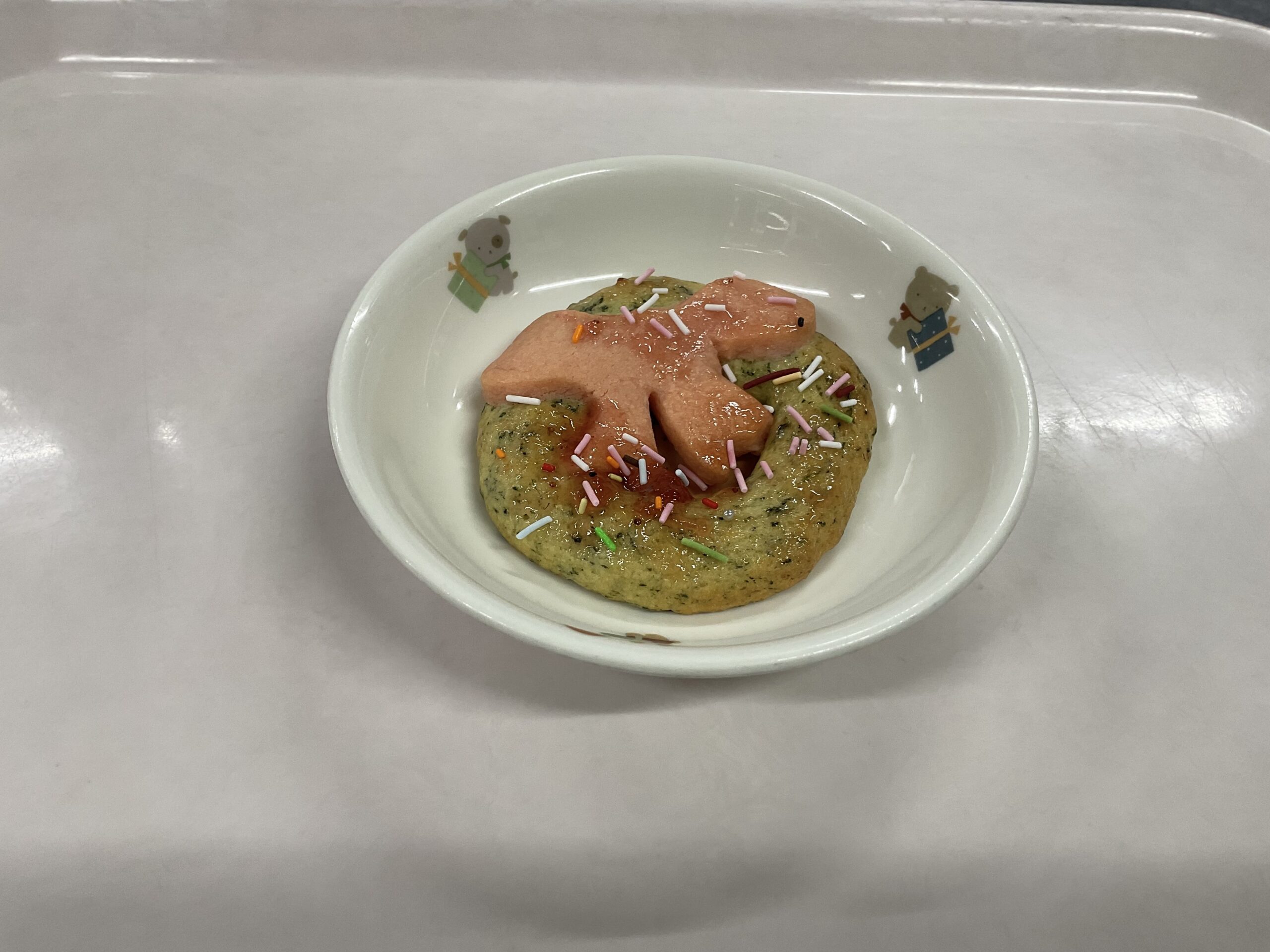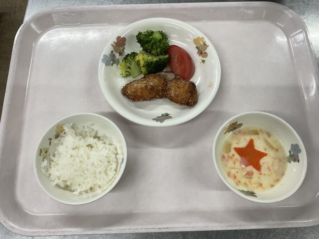 白米 魚のアーモンド揚げ ゆでブロッコリー トマト クリームスープ