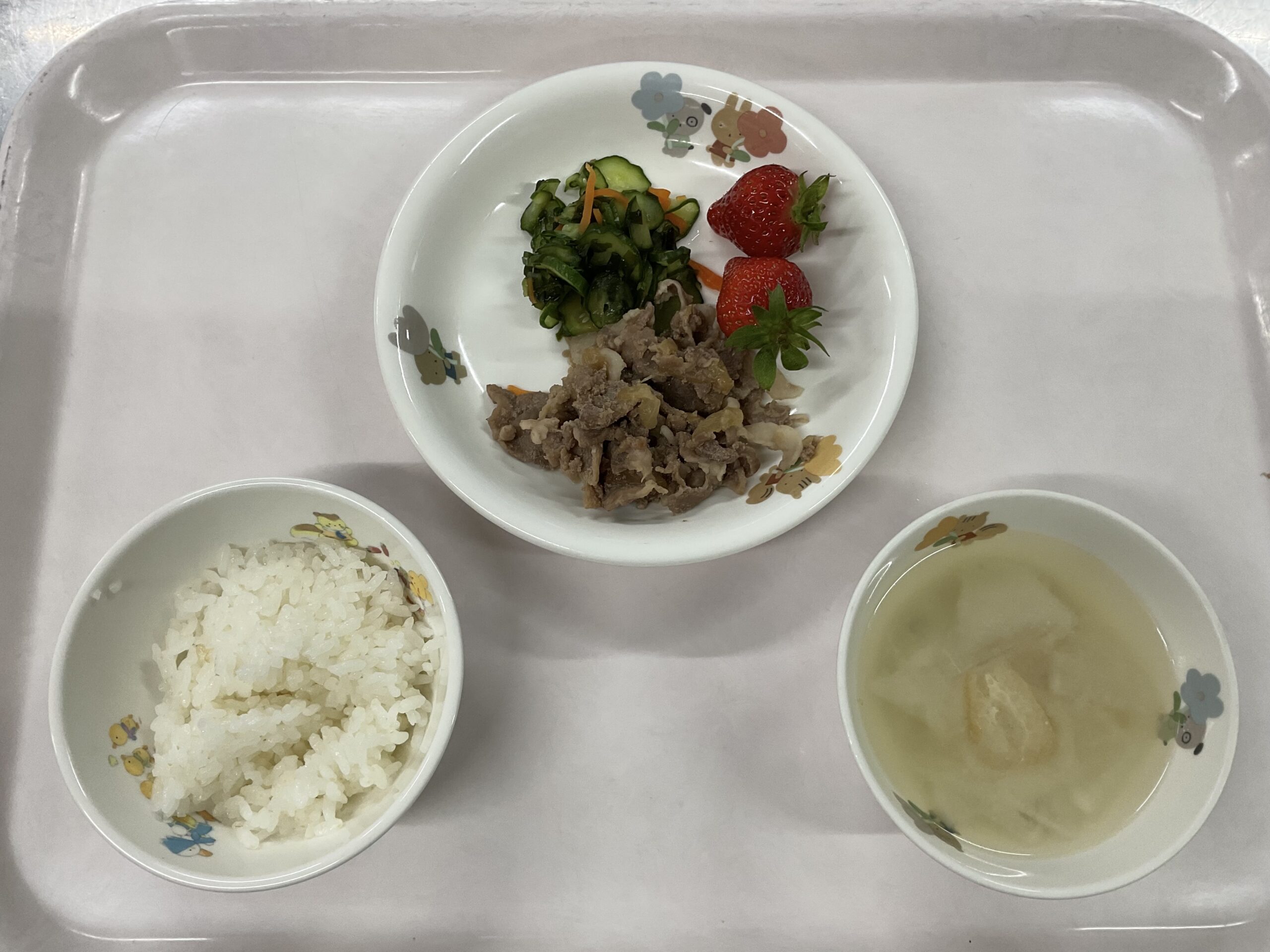 白米 豚肉の生姜焼き きゅうりの酢の物 大根の味噌汁 いちご
