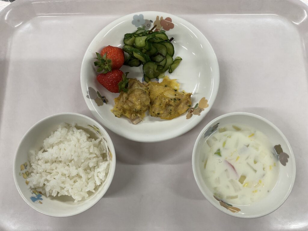 白米 鶏肉のチーズピカタ きゅうりの昆布和え 野菜のミルクスープ いちご