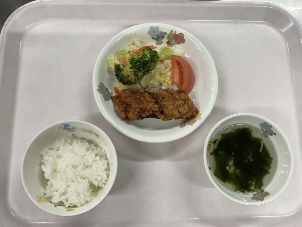 白米 魚の竜田揚げ 野菜のごまだれ トマト えのきとわかめのスープ