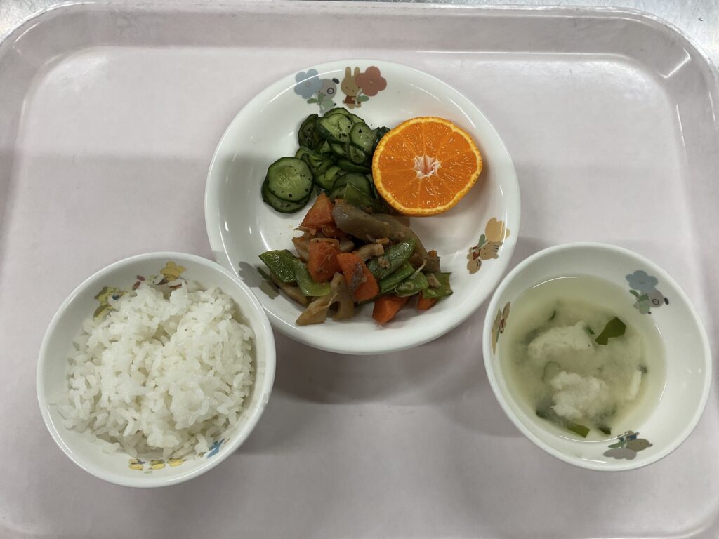 白米 筑前煮 きゅうりのゆかり和え すり身の味噌汁 みかん