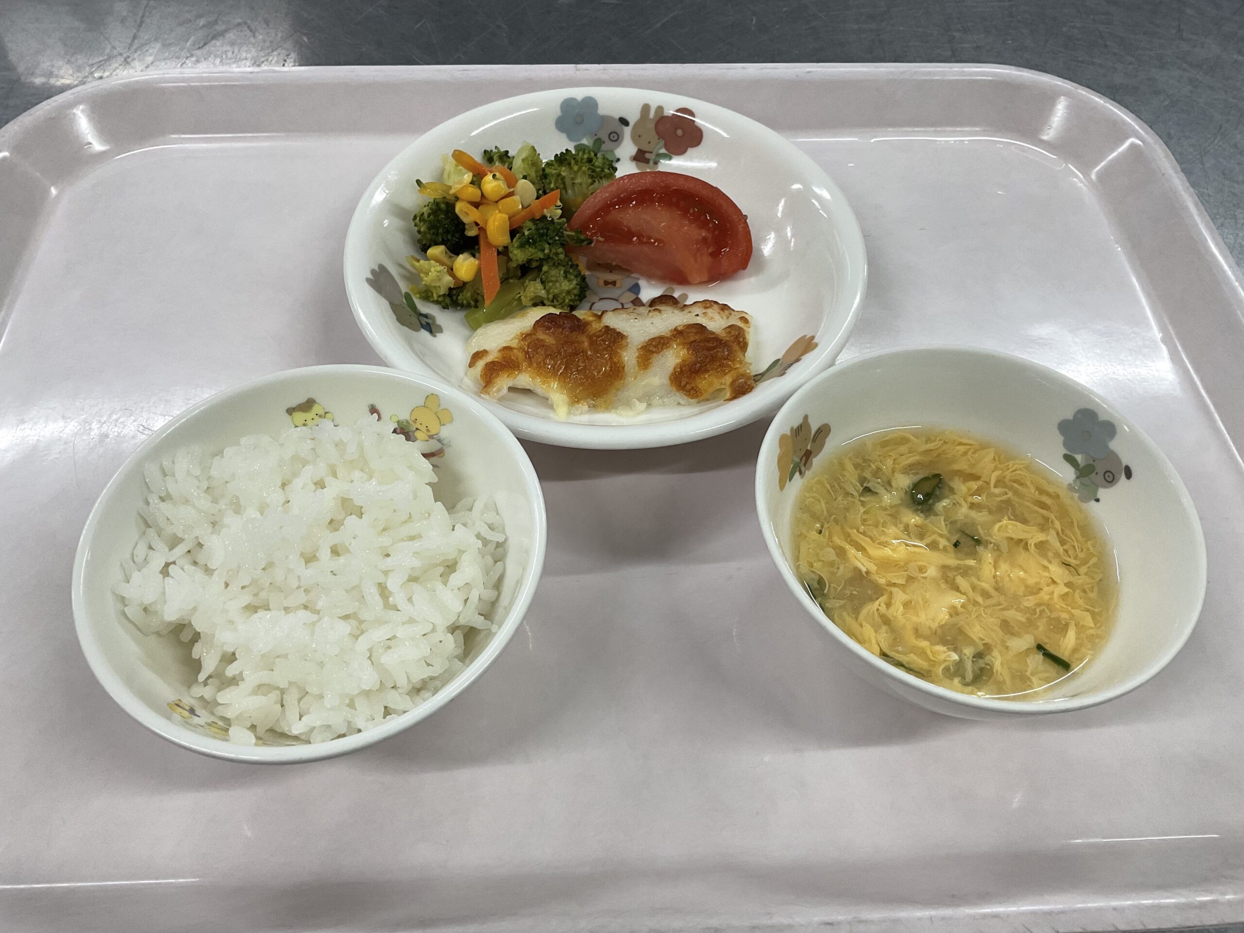 白米 魚のチーズ焼き ブロッコリーサラダ トマト ふわふわ汁