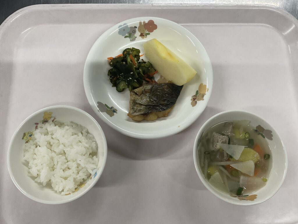 白米 魚の蒲焼き きゅうりの酢の物 さつま汁 りんご