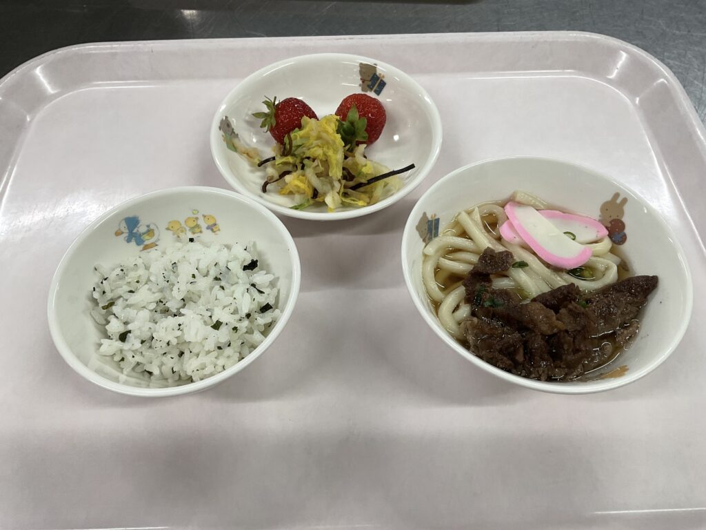 わかめごはん 肉うどん 白菜の昆布和え いちご