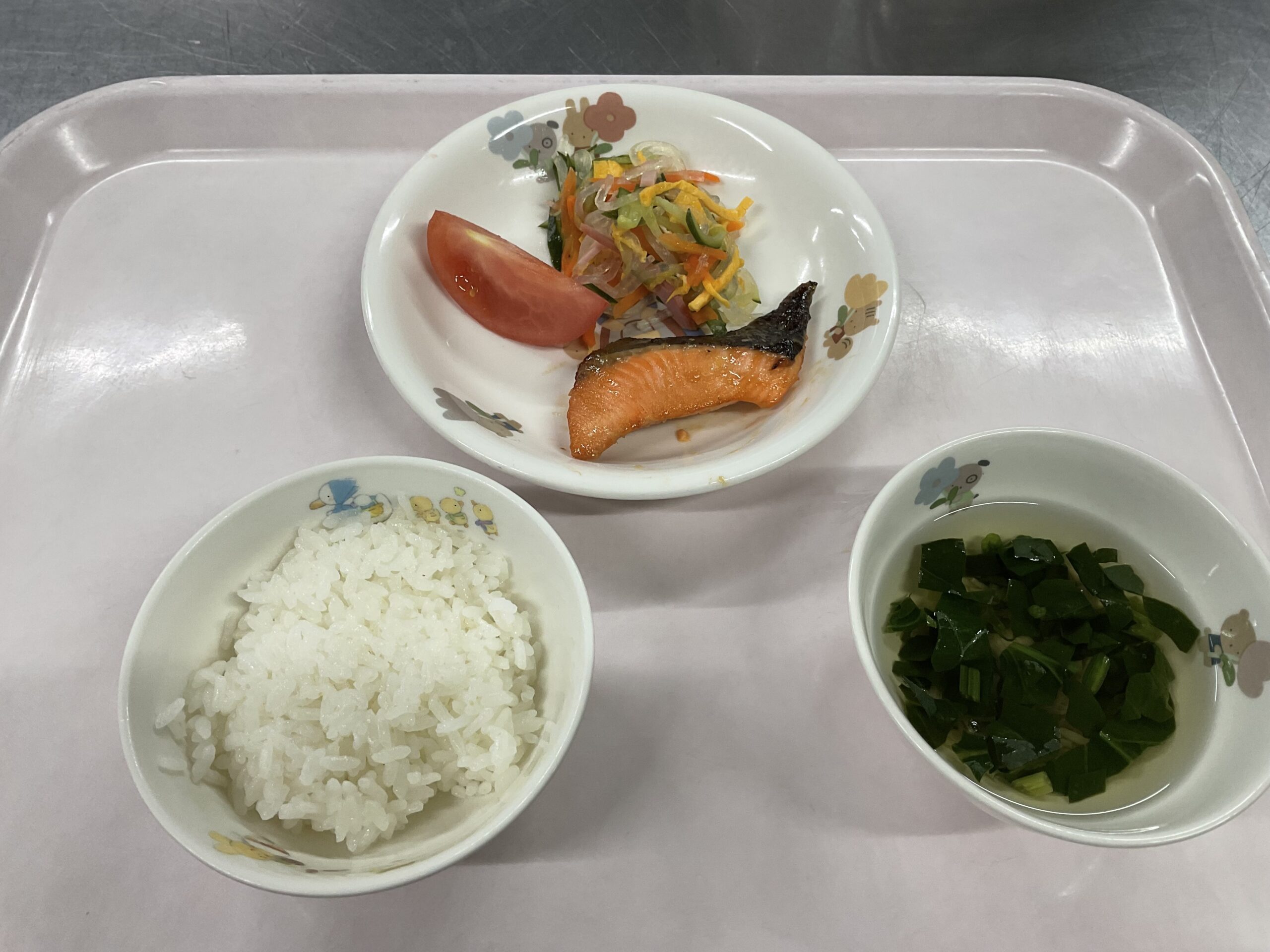 白米 鮭のみそ焼き 伴三糸 トマト ほうれん草のすまし汁