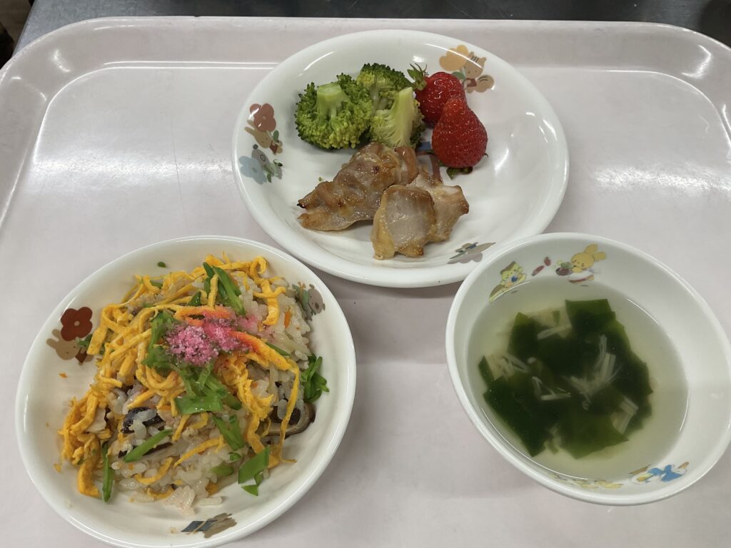 ちらし寿司 鶏肉の照り焼き ゆでブロッコリー えのきとわかめのスープ いちご