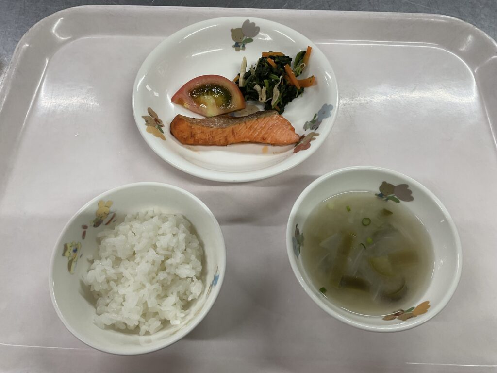 白米 鮭の塩焼き ほうれん草とささみの和え物 トマト なすの味噌汁