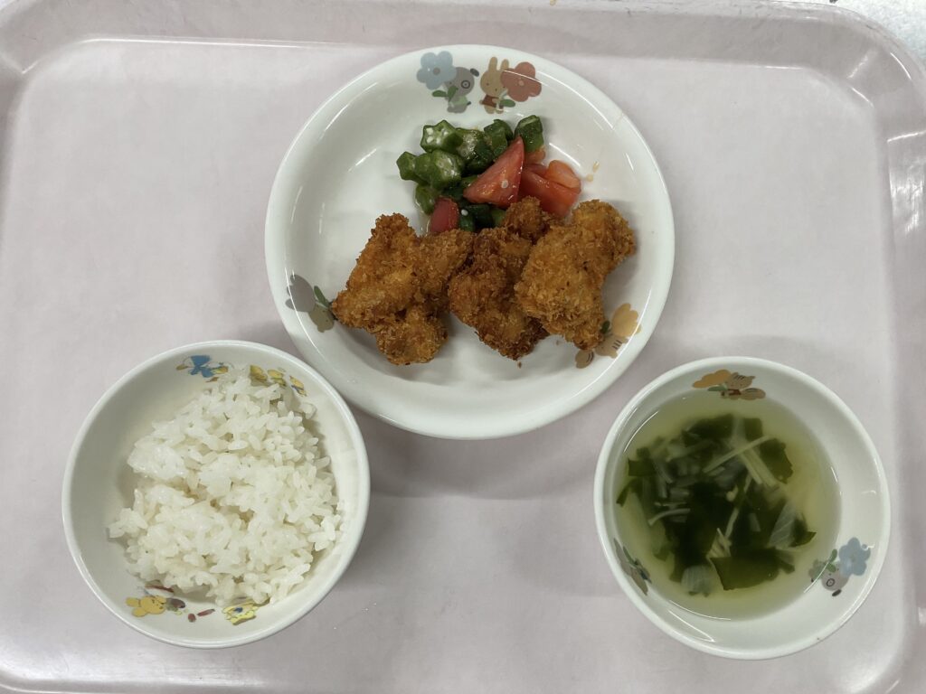 白米 チキンカツ オクラとトマトのサラダ えのきとわかめのスープ
