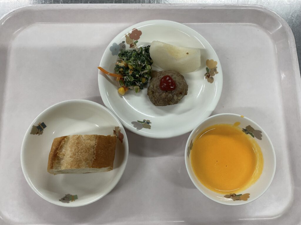 フランスパン ハンバーグ ほうれん草とツナのサラダ 人参のポタージュ 梨