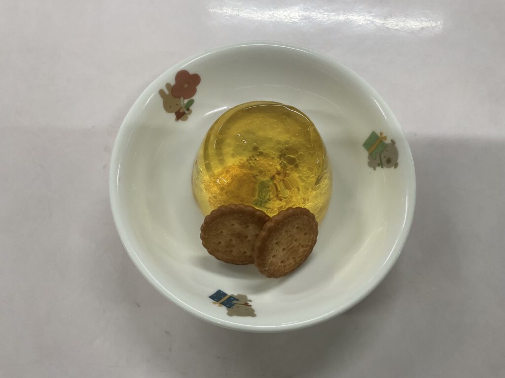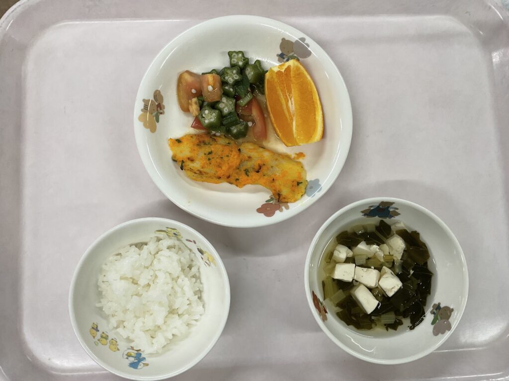 白米 魚のあけぼの焼き オクラとトマトのサラダ 豆腐と小松菜のすまし汁 オレンジ