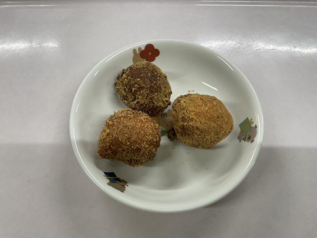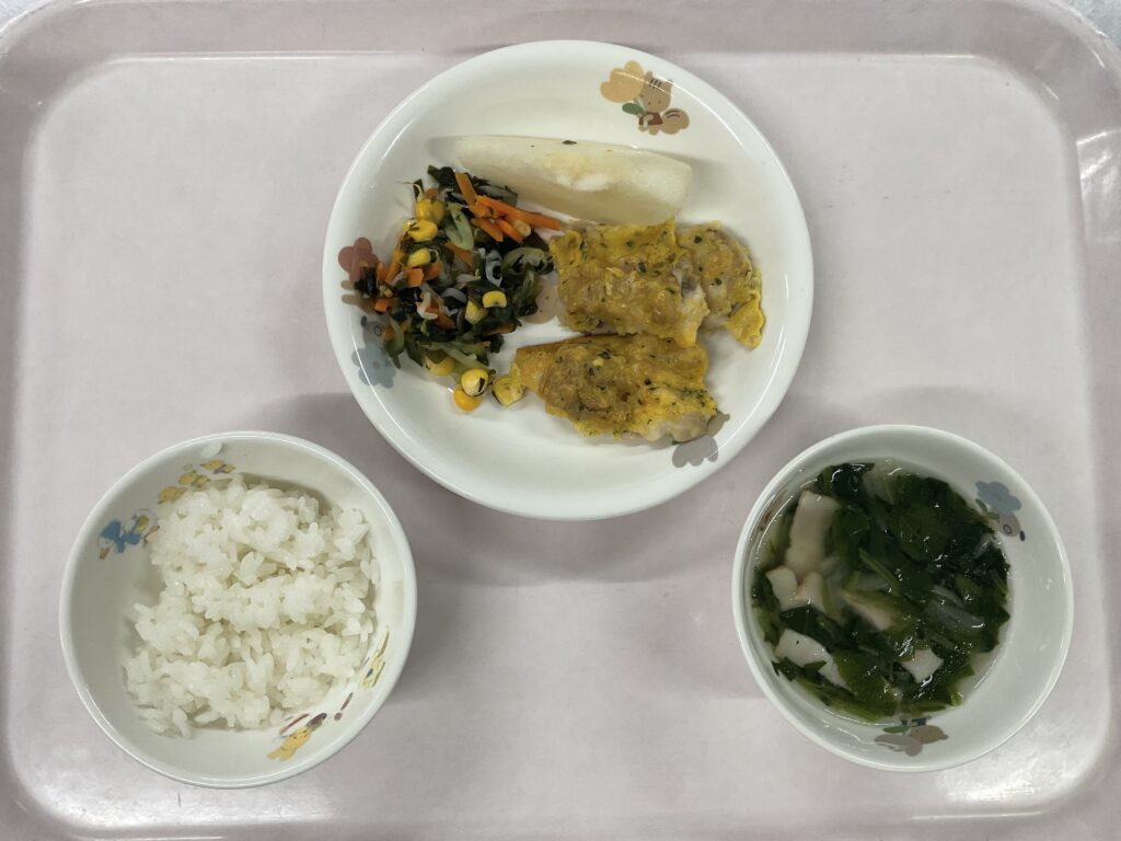 白米 鶏肉のチーズピカタ ナムル ベーコンとほうれん草のスープ 梨