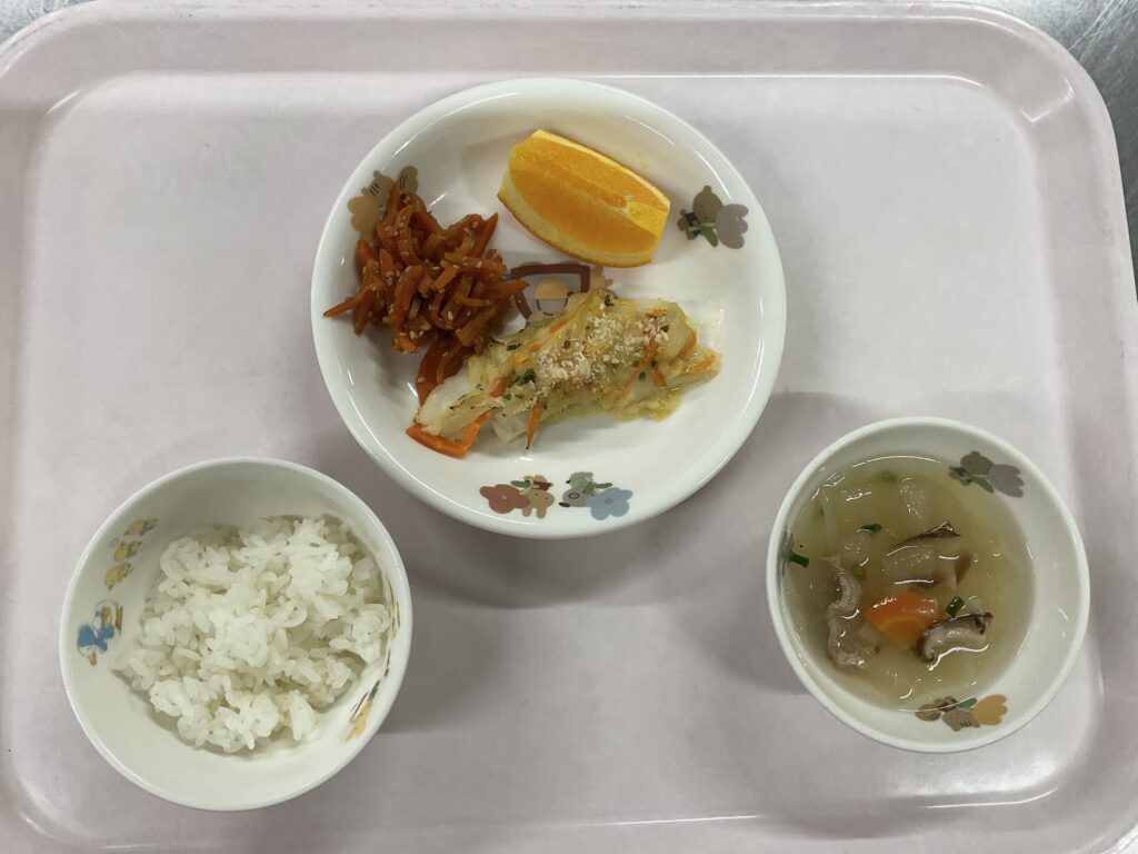 白米 魚の味噌マヨ焼き 人参きんぴら オレンジ とうがんのスープ
